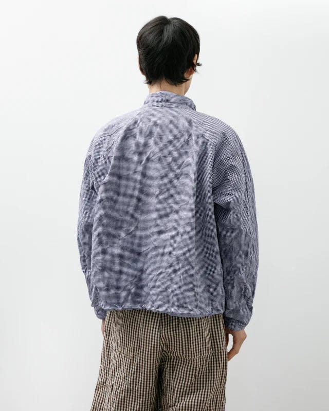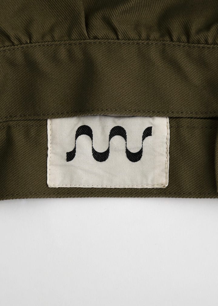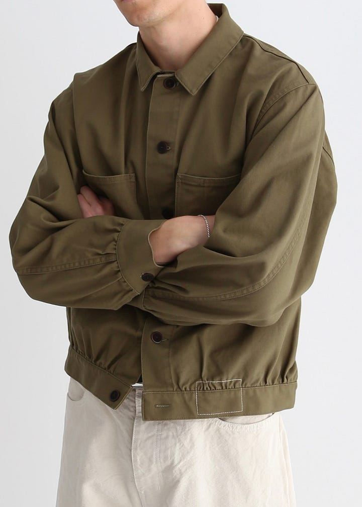 The jacket is made in Japan from 12oz Japanese cotton serge and finished with corozo buttons. The fabric settles in and improves with wear over time and breaks in beautifully. The original jacket had a placket that crossed over at the top, but we simplified that so it buttons straight up instead.