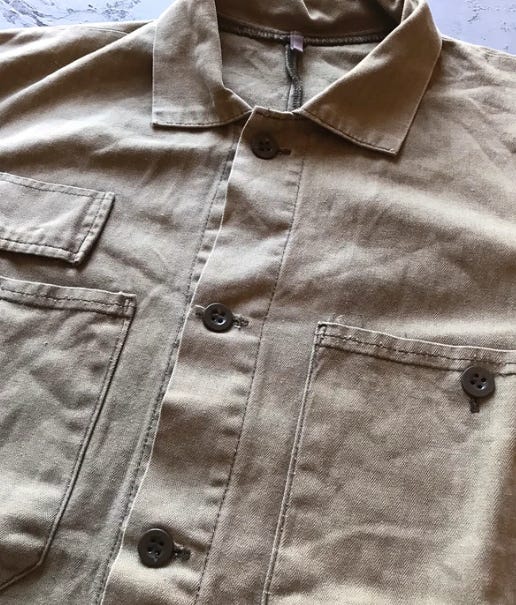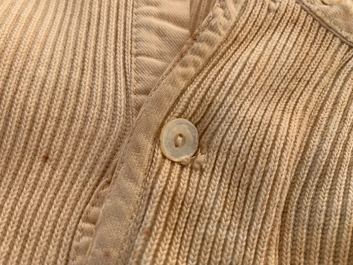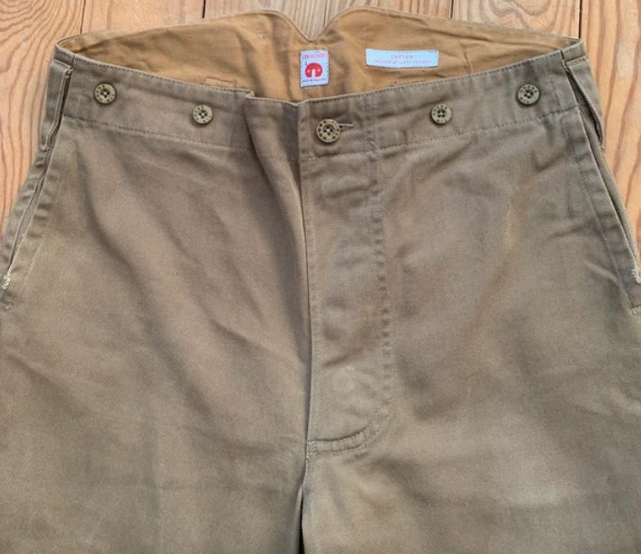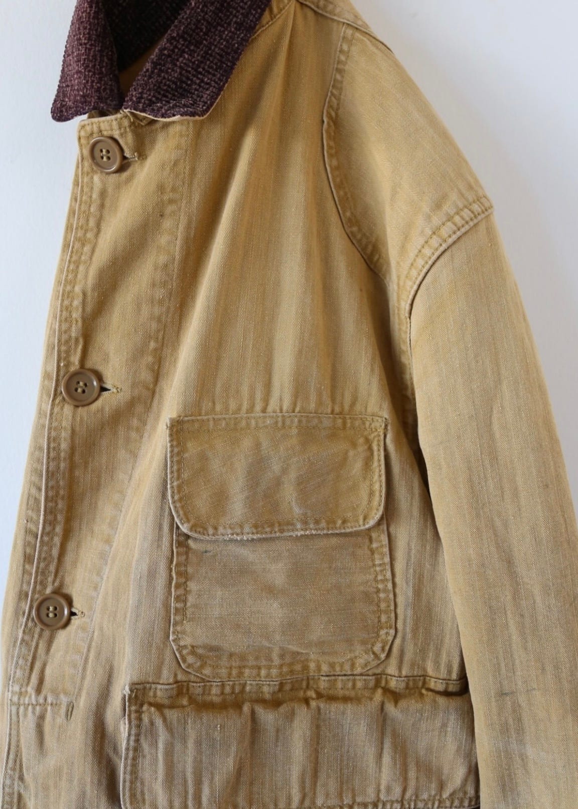 I also love finding HBT, or herringbone twill. I’ve always liked HBT because it was widely used during WWII for military uniforms since the weave made it strong but still breathable. We’ve had a certain hunting jacket that used HBT in the 40s and 50s and the fabric is just so good. We also had a war-era chore jacket that was made from a white HBT that was really beautiful and it also had Laurel wreath buttons!