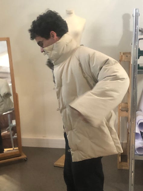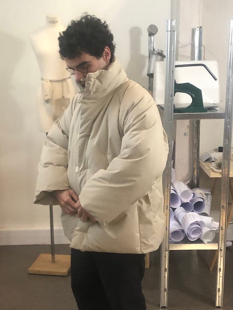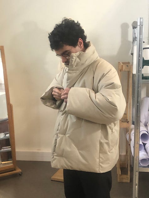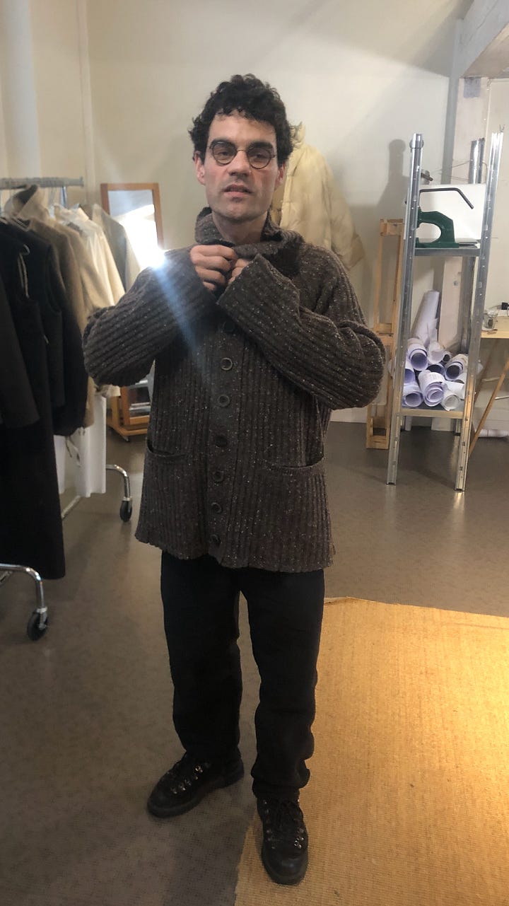 Next, I met up with Peter Sherno to visit Maison Douillet. Clément and his brother Germaine have turned their atelier — part of a two-year residency they’re doing in Paris — into a make-do studio. Like Thurston, and like Conkers (below), Maison Douillet’s clothes breathe the air of the place they come from. In this case, that’s the French Alps, and more specifically, the daily reality of living in a French mountain town.